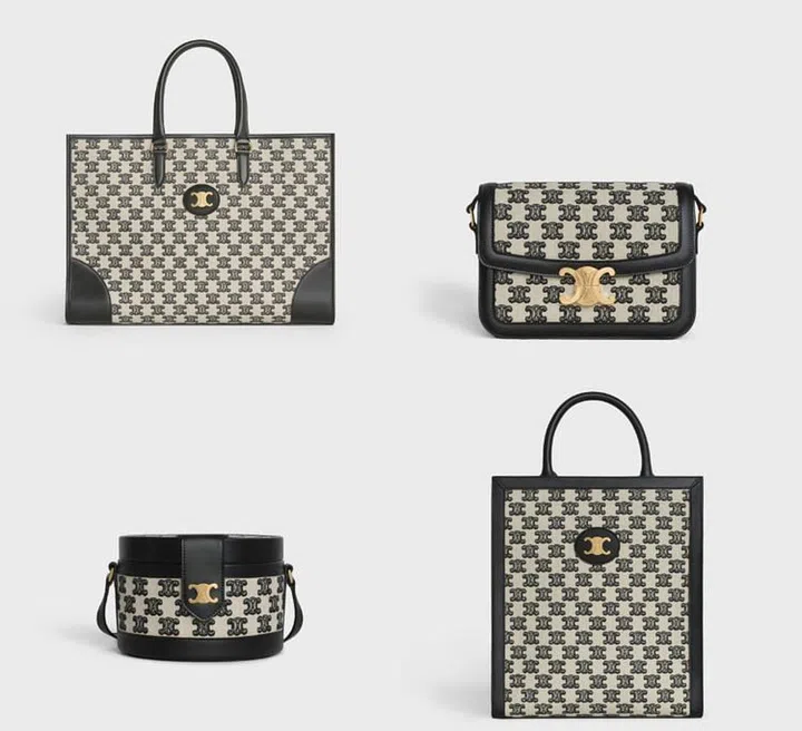 Celine Triomphe Embroidery 黑色系列手袋。左上顺时针:Horizontal Cabas、Triomphe、Teen Vertical Cabas、Small Vertical Cabas Medium Tambour手袋。