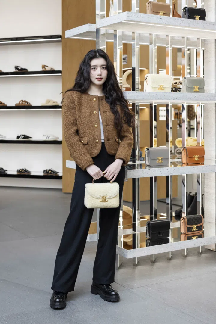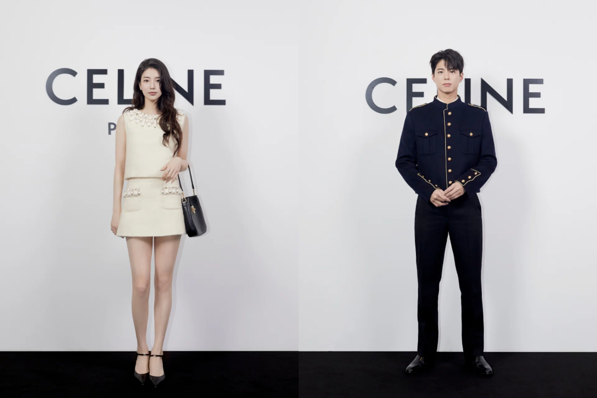 为庆祝品牌开幕,Celine特邀全球品牌大使朴宝剑与裴秀智亲临新加坡。朴宝剑身着海军蓝羊毛西装外套,内搭白色棉府绸宽松衬衫与黑色羊毛华达呢经典长裤,脚踩黑色亮面小牛皮切尔西靴,尽显绅士风范。秀智则身穿Celine香草色绣花粗花呢上衣与同款迷你短裙,搭配黑色小牛皮Triomphe绑带猫跟鞋,并手拎黑色小号Camille 16柔软牛皮包,展现优雅魅力。