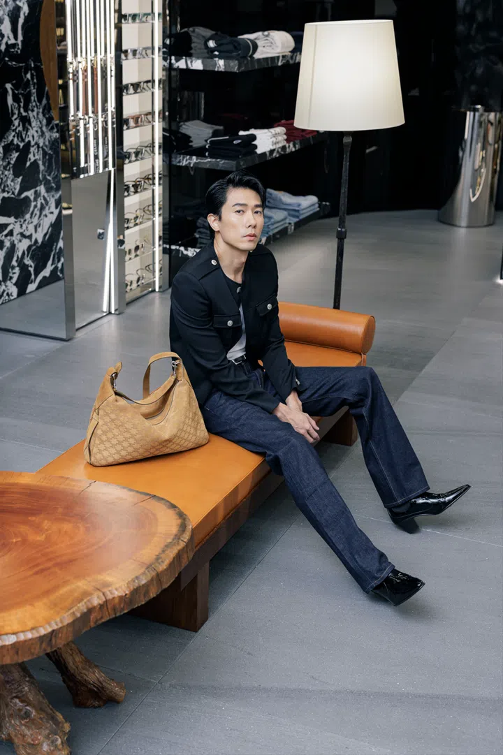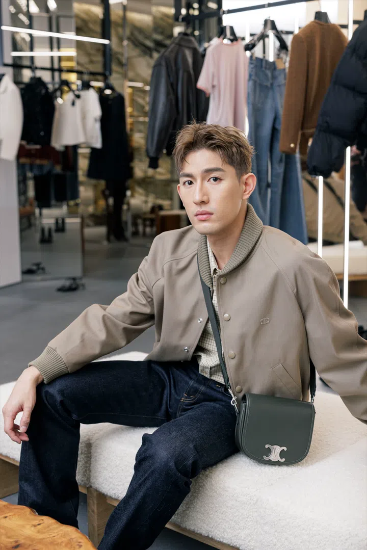 陈泂江身穿斜纹羊毛军装夹克,搭配原色水洗丹宁Kurt牛仔裤,肩背满印Triomphe 图案麂皮小牛皮Romy手袋,脚踩光面小牛皮切尔西靴。