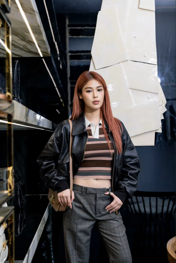 陈一心身穿Celine柔软小羊皮宽松飞行员夹克,内搭条纹棉质Triomphe短款Polo衫,下搭格纹羊毛长裤,肩背光面小牛皮青铜色Teen Triomphe手袋。