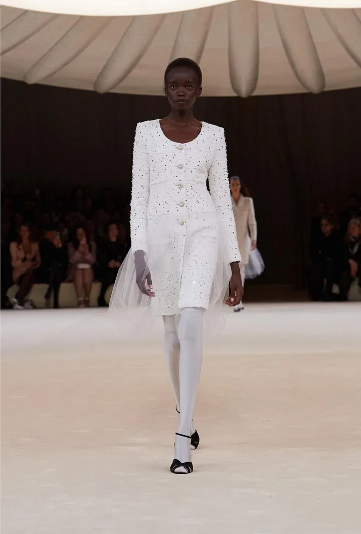 Chanel 2024春夏高级定制系列中的连身裙,同样运用精致的薄纱、亮片、刺绣等超高工艺,展现香奈儿女性的优雅光芒。