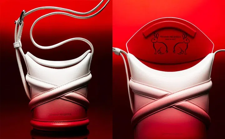 Alexander McQueen农历新年系列主要以寓意好运和喜庆的中国红为主色调,并将其与柔和象牙白色融合并置。这款Curve系列手袋采用艳红色和象牙渐变色柔软小牛皮,灵感源于马具的轮廓,一打开包包露出品牌特别设计的双兔图案,表达对农历兔年献上真挚祝福。