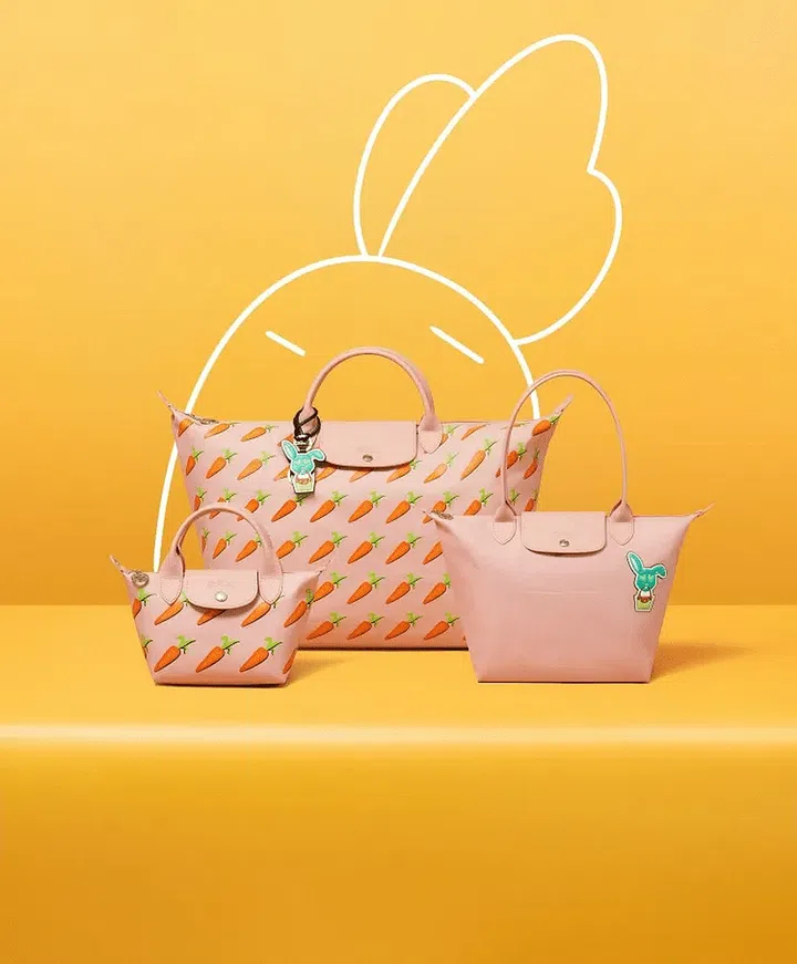 在十二生肖中,兔子作为最幸运的象征,预示着更加美好的一年。本次Longchamp兔年限量系列包含旅行包、迷你手提包、单肩包三款经典包型。其中经典的大号旅行袋及迷你饺子包,均以山楂粉色为基调,并用胡萝卜元素作为点缀,为包袋增添别样趣味。