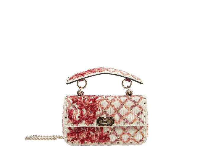 Valentino Garavani 的 Rockstud Spike小包,出自Valentino 2019早春系列,采用意大利制成的柔软绗缝皮革,镶上精细的粉红色珠绣,柔美浪漫,与充满个性的标志性铆钉元素,碰撞出另类火花。包身也刚好能够容纳日常出行的必备小物,方便实用。