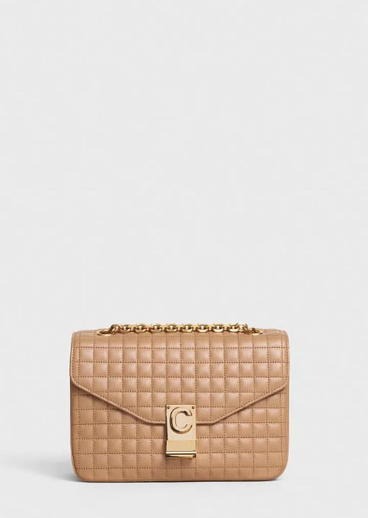 2019春季,Celine推出四款全新包袋,除了有Lady Gaga率先曝光的Celine 16 包包外,还包括C Bag、Triomphe及C Charm包袋。其中,这款名为C Bag的中号绗缝小牛皮肩背包,在今年9月举行的2019春夏巴黎时装周上引起热烈讨论。Celine C Bag包身的方格设计复刻了1980年代的Celine经典皮包,字母C金属扣灵感源自1970年代的Celine Closure,而链带则效仿围绕法国凯旋门的铁链。环环相扣的复古元素,想必是设计师借由首个系列想历史致敬。C Bag为中号尺寸,共有闪亮小牛皮、绗缝小牛皮和稀有皮革可选择,简洁大方,百搭精致。