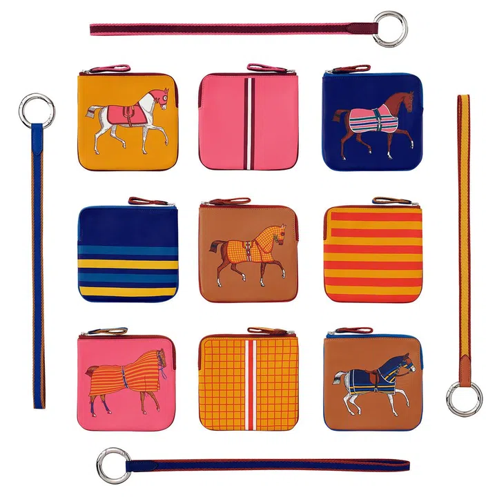 这个秋冬,又有新成员加入Hermes的大家庭。这款名为Carre Pocket小皮件重新诠释了Jacques Eudel 设计的 Couvertures Nouvelles 丝巾,一面印有独特的马匹图样,另一面则印上马毯上的花样细节。每个小包单独售卖,也可将三个不同款式拼凑一块,依个人喜爱自由搭配Galon网状编织带把它变为吊饰。