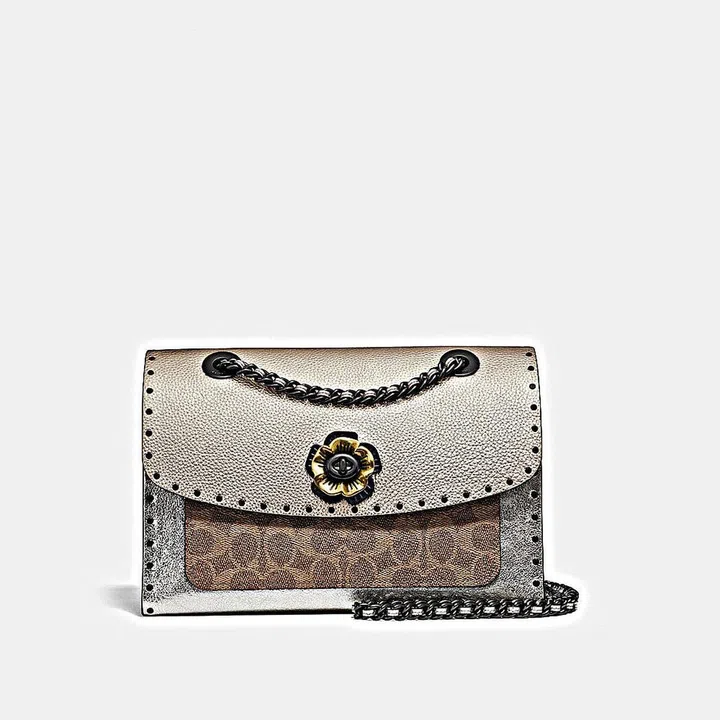 结构方正,包身轻盈,Coach的这款Parker铆钉蛇皮细节经典帆布手结合了生活优雅与都会随性。功能多样化,这支包袋以鹅卵石颗粒皮革与经典帆布打造而成,侧边则以真蛇皮制成,缀有柔软铆钉,采用Coach茶香玫瑰转扣开合,散发一种率性却不失小小的优雅,大胆的撞色让包包格外出彩。
