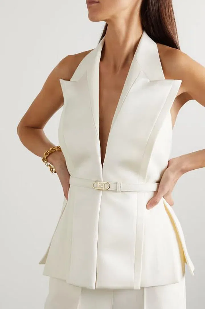 一般来说,西装背心是“三件式西装”的其中一部份,会与衬衫和西装外套搭配,不过对时髦上班族而言,将西装背心作为上衣,轻松释放轻潇洒干练气场,令人印象深刻。