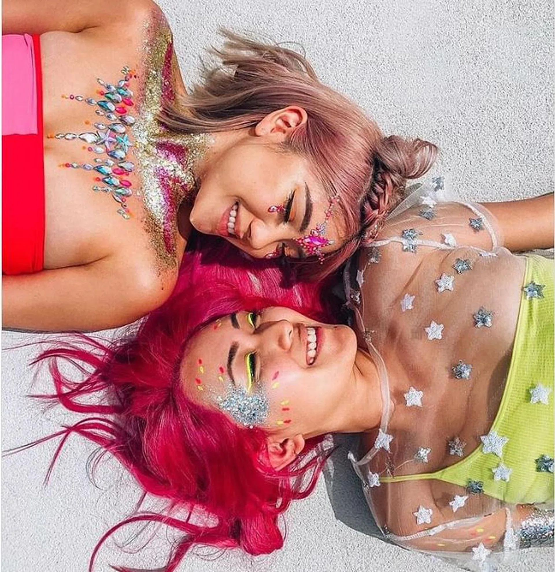 网红模特儿Celine Lineart与IG伙伴Mary Shay选择以最缤纷亮丽的姿态出席盛大派对,除了脸上的亮片,荧光黄与橙色眼线也很抢眼,嘴唇保持裸色即可。