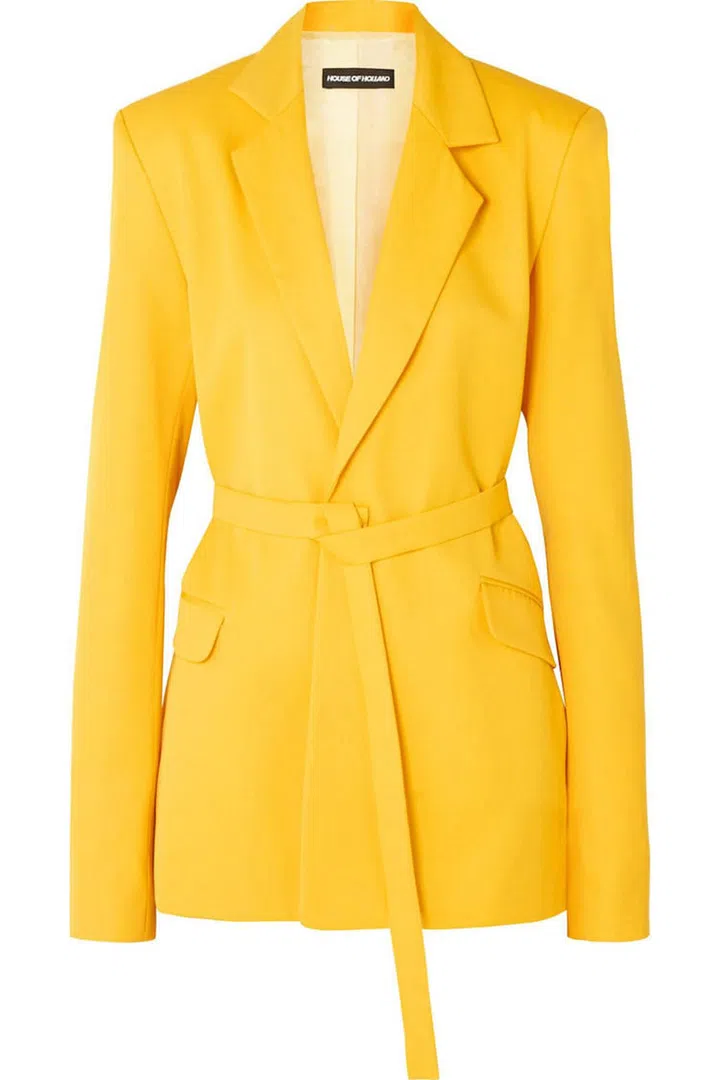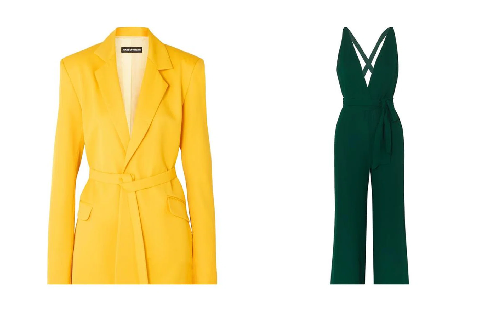 黄色和绿色在色轮上彼此相邻(即类似),因此搭配起来一定好看。此外,翠绿色和黄水晶黄色,同属一个颜色系列 ——宝石色调 ,这也是为什么两者搭配起来特别醒目和亮丽。建议:我们选择了House of Holland笔挺的西装,配上Reformation潇洒深V连体裤。你可搭配一条吊坠项链与一双时髦的凉鞋高跟,散发活力气息。