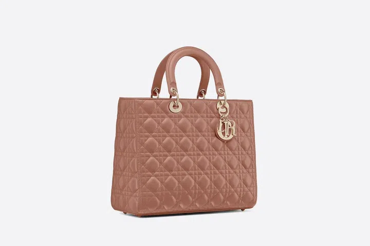 论长青不败的手袋款式,Lady Dior绝对占有一席之地,自90年代推出至今屹立不倒,始终是品牌的高人气手袋之一。这款大号的Lady Dior,选用胭脂色羊皮制成,带有经典的Cannage藤格纹图案缝线,配搭淡金色色调金属“D.I.O.R.”吊饰,低饱和度的粉嫩色彩,凸显女性知性温柔的气质。手袋也附有可拆卸的幼身皮革肩带,可手提、肩背或斜背。
