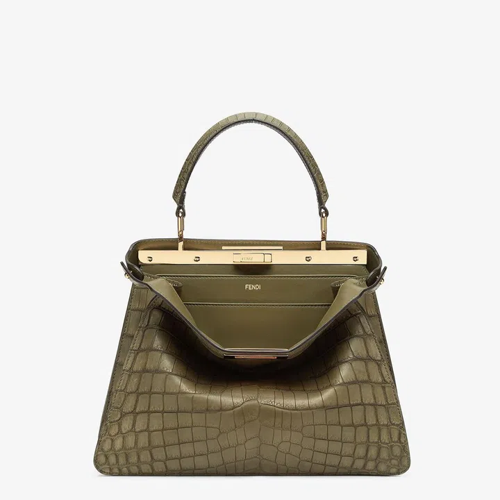 永不过时的Peekaboo ISeeU中号手袋,墨绿色调沉稳高雅,也为开春增添清新气息。包身两面采用不同材质制作而成,一侧为稀珍的鳄鱼皮材质,另一侧是同色系皮革,两侧也饰有标志性扭锁。手袋配有手柄和可调节可拆卸式肩带,搭配不同着装,提供灵活背法。