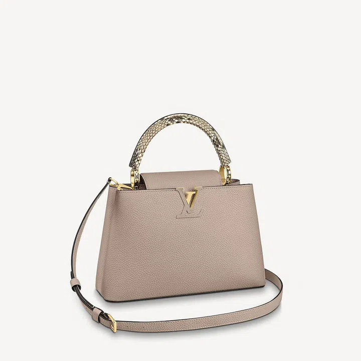 Louis Vuitton简约不简单的经典手袋,是一款可以长久陪伴女人的包包。Louis Vuitton Capucines包身是全粒面牛皮革,手柄则是珍贵的蟒蛇皮,加上万能百搭的浅奶咖配色,尽显优雅贵气,无论日常上班或出席正式场合,都能为造型秒速加分。