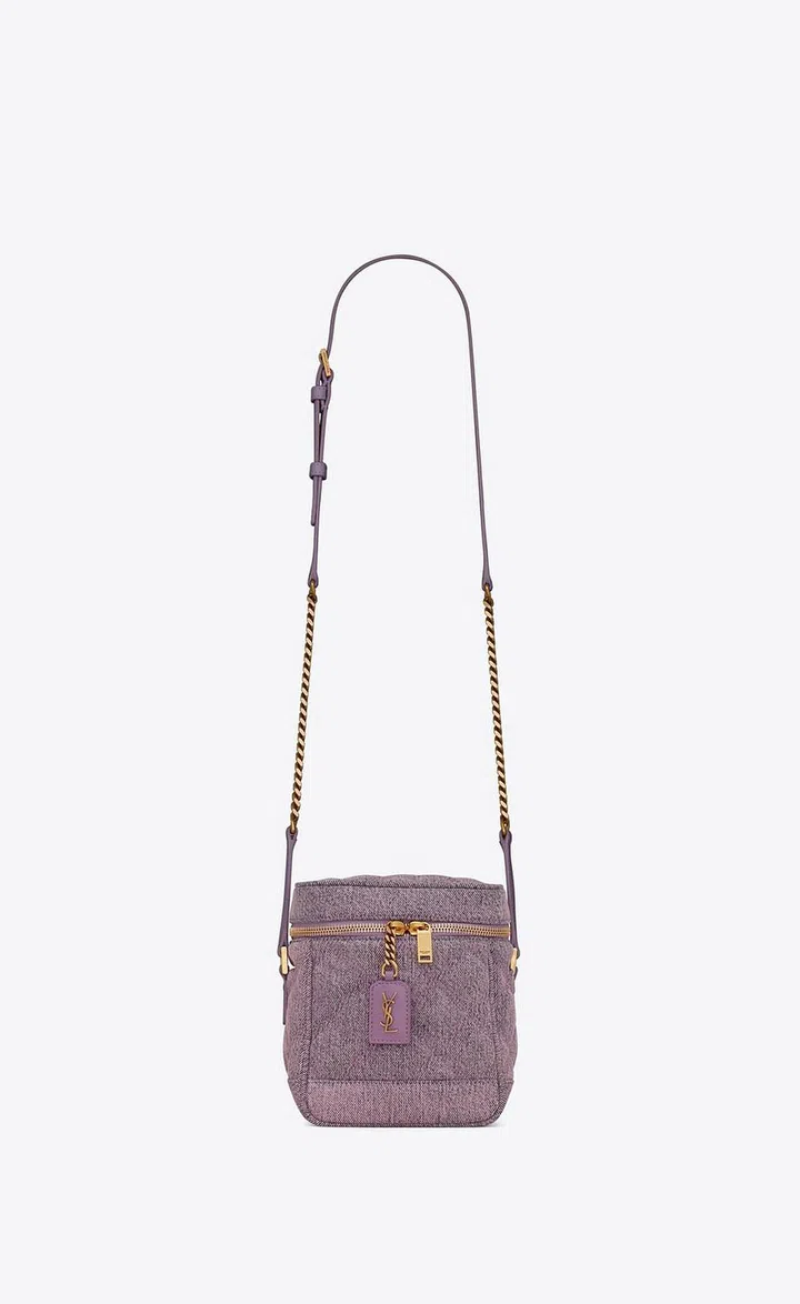 Saint Laurent充满80年代复古氛围的化妆箱手袋,外型方正端庄,环绕式拉链设计,饰有方形纹绗缝包缝和YSL字母标志标签,淡紫色的牛仔织物材质增添率性风格。