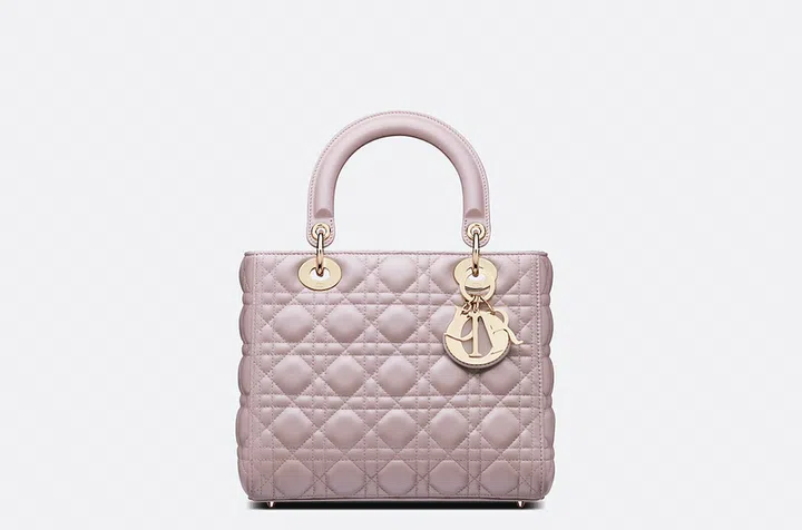 Dior最具代表性的经典手袋之一,高贵典雅,历久弥新。这款带着珍珠光泽的淡紫色中号手袋,以柔软的羊皮和Cannage 藤格纹图案缝线制成,配搭淡金色的“D.I.O.R.”金属吊饰,散发温柔内敛的淑女光芒。