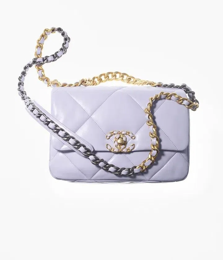 Chanel于2019年推出的手袋,名字中的19不仅代表它诞生的年份,也是香奈儿女士Gabrielle Chanel的出生日期,面世短短几年,如今已经成了香奈儿新一代的标志性包款。以柔软的小羊皮制作,配搭三色金属皮穿链肩带,以及放大处理的双C饰扣和菱格纹,披上粉嫩的淡紫色外衣,优雅与朝气集于一体。