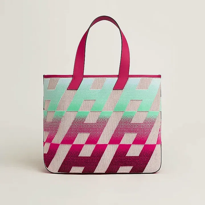 爱马仕的Cabas H en Biais手袋上的印花,源自1970年代品牌档案馆中的设计。对比柔和色彩的提花帆布与底部的珍贵皮革,让这款手袋格外醒目。共有种尺寸(27和40),皆配有皮革手柄,营造出绚丽高雅的外观。