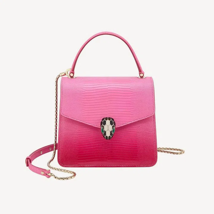 这款宝格丽Serpenti Forever系列小号手提包,采用珍贵的甜菜红尖晶石紫红色渐变蜥蜴皮手工精制和上色,展现品牌的细腻材质与精湛工艺。包包附有形链条与皮革肩带,饰以标志性蛇首磁扣,内部设有三个隔层,方便携带日常用品,更具多变魅力。