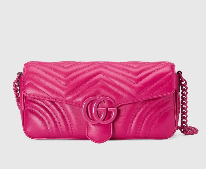 Gucci 宠儿精选手袋中的GG Marmont系列手袋是品牌标志性的单品之一,特点在于高辨识度的双G配件及繁复的绗缝饰面,这款单肩包采用紫红色皮革打造,链条及配件也均以同色系呈现,为造型注入一抹亮眼精致的格调。