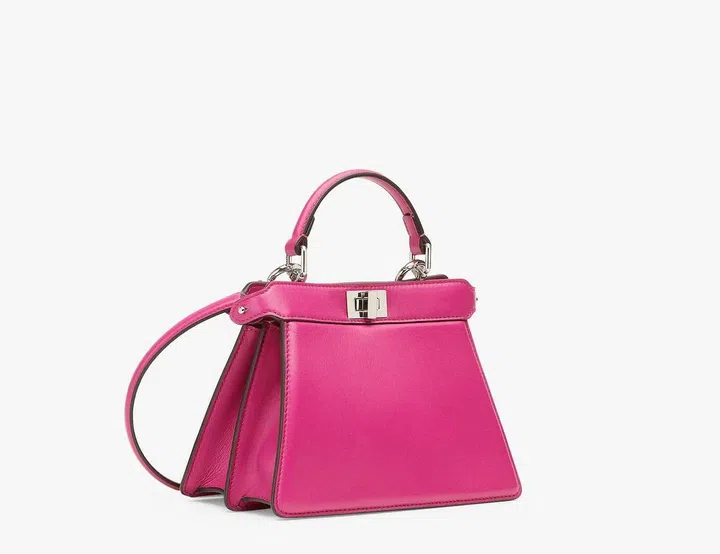 Fendi Peekaboo手袋系列自问世以来,陆续推出不同材质、尺寸等丰富精彩的设计。这款Peekaboo ISeeU Petite手袋,小巧可人,紫红色带夹层纳帕软皮革材质,两侧缀以经典的扭锁,配有内袋和银色金属件,彰显女人的高贵迷人的姿态。