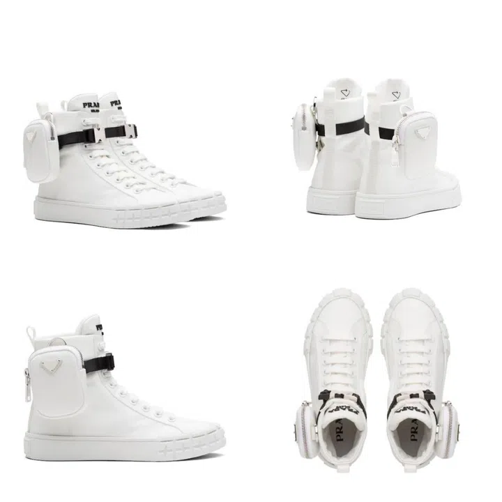Prada的女士运动鞋采用创新材料制成,彰显独特的女性气质。就如这款Wheel Re-Nylon再生尼龙华达呢高帮运动鞋,采用的是海洋塑料回收物所制成的再生尼龙材质,提倡品牌的再生时尚概念。运动鞋上还饰以一个拉链式可拆卸尼龙小袋,尽显与众不同的独特格调。