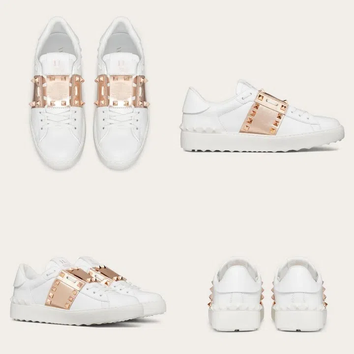 Valentino Garavani的 Rockstud Untitled小牛皮铆钉运动鞋以白色小牛皮于意大利制造,正面的金属色拼接料清新迷人,搭配品牌的经典铆钉元素,任意搭配搭配连衣裙或精裁长裤,都很亮眼。
