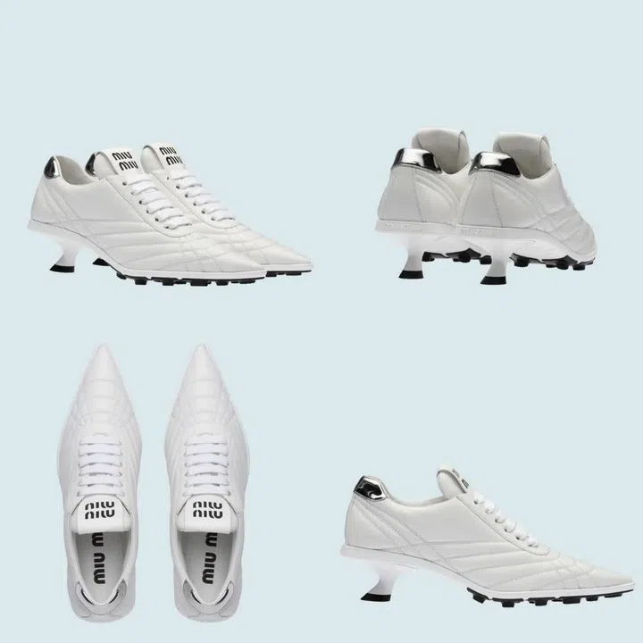 时尚就是要不一样!充满运动风格的Miu Miu 2021年春夏系列,将sporty气息从服装延伸至鞋履。这双Miu Miu软羊革中跟运动鞋配有涂漆中跟,新颖地重释足球鞋,格外引人瞩目。