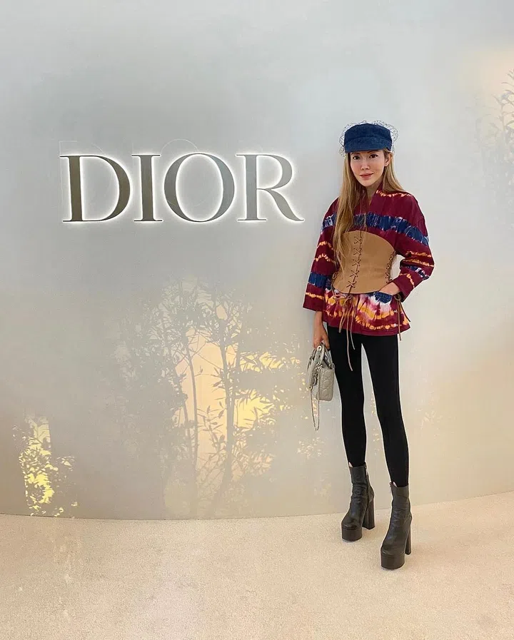常出席时尚活动的名媛Wendy Long,选择了深红色扎染上衣系上Corset腰带,下身则以紧身裤和灰色高跟及踝靴做搭配,最后不忘戴上Dior帽子和经典Lady Dior迷你包,提升造型的完整度。