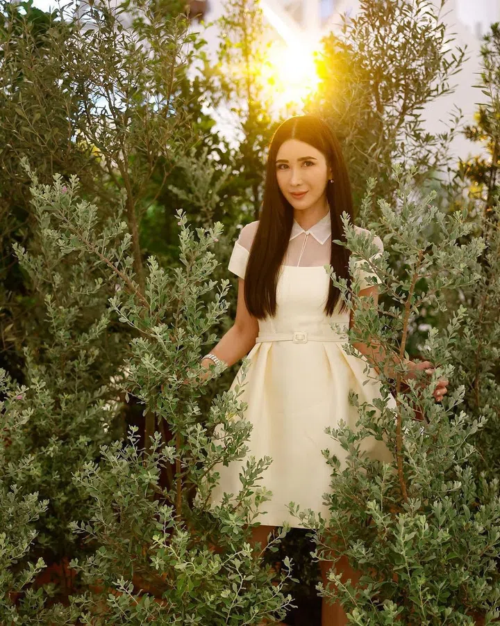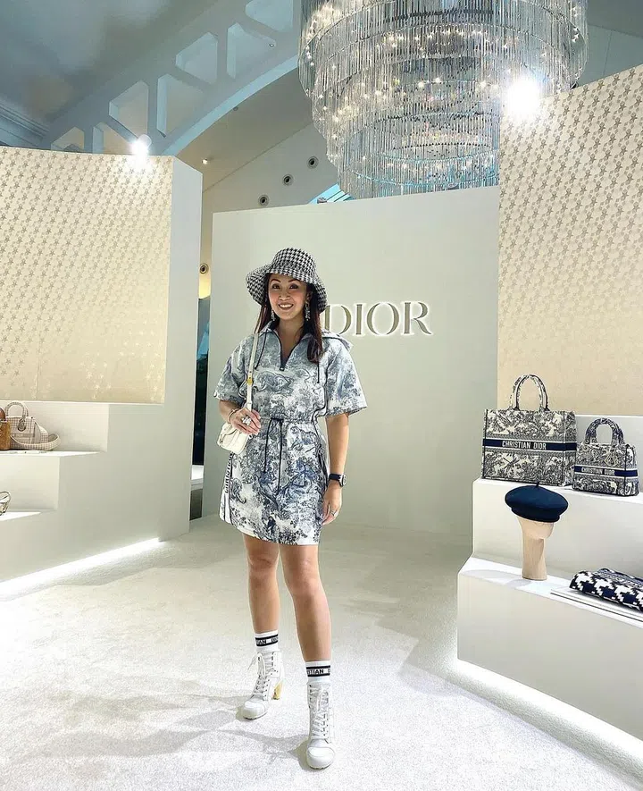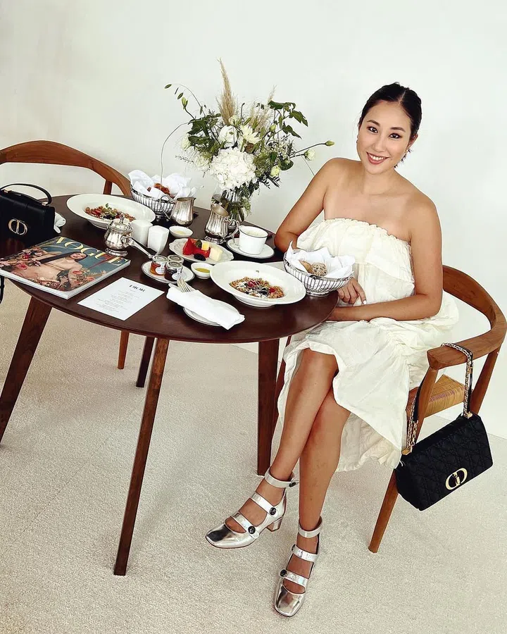 时常以Dior造型亮相的本地名媛Jamie Chua,当然不会缺席新加坡的Dior Café。她身着白色短款连衣裙亮相,上身采用透视设计配以喇叭形剪裁,腰带突显腰部曲线,呈现精致造型。另外一张照片中,她配上同色系的Dior夹克与D-Doll高跟鞋。