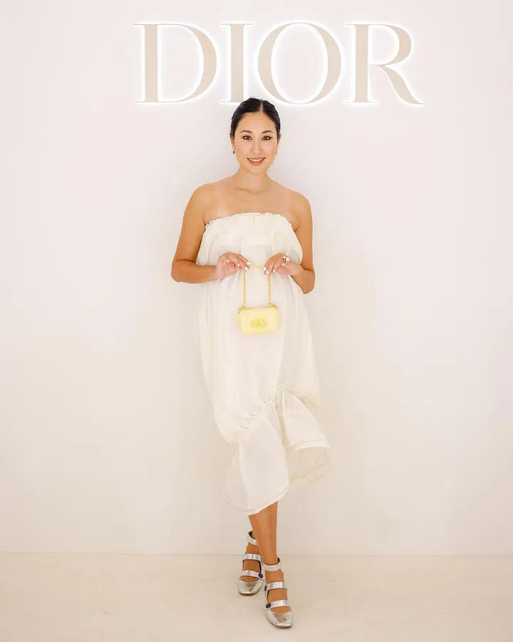 怀着第二胎的时尚达人Jamie Wu以一袭简约大气的白色抹胸连衣裙出席Dior活动,裙摆的不规则抽绳设计为造型增添亮点,脚上的D-Doll 高跟鞋完美映衬,手中的超迷你Dior Caro手袋更是俏皮十足。