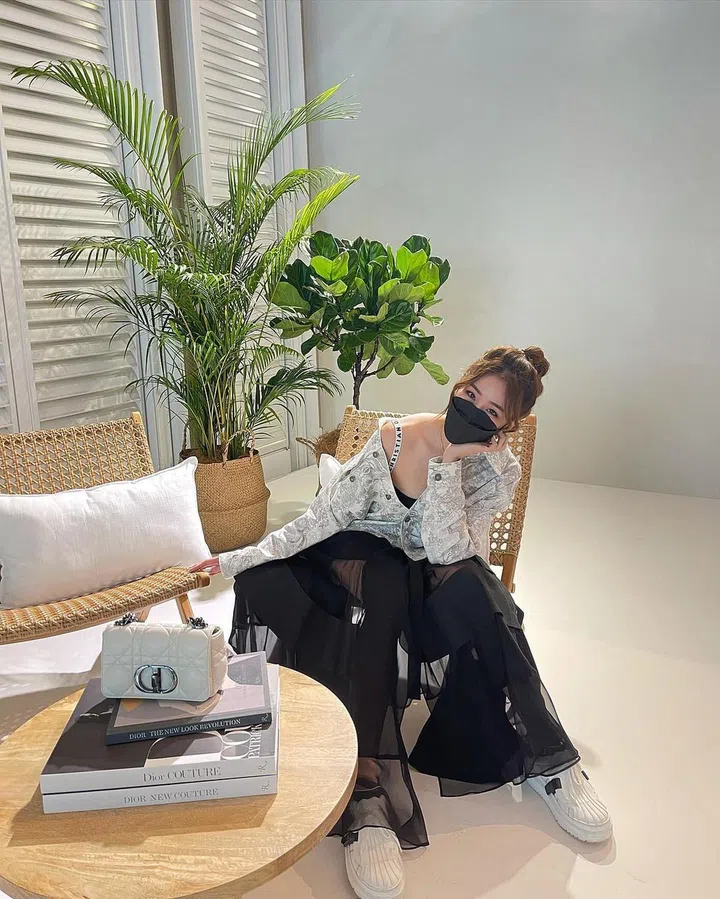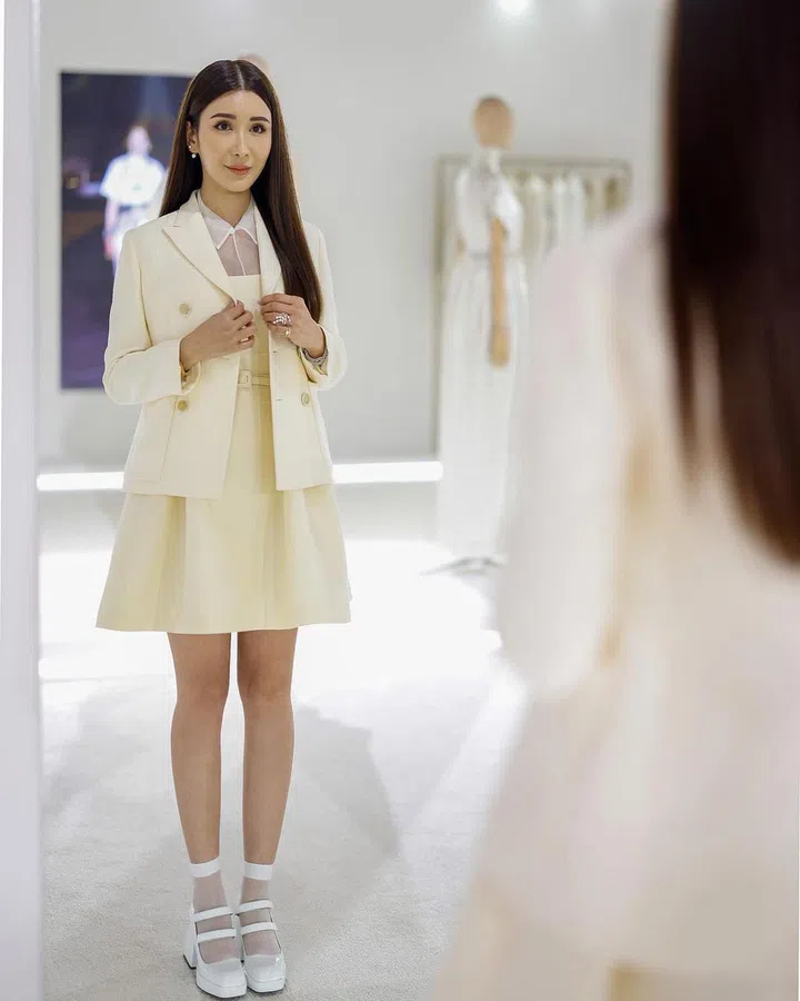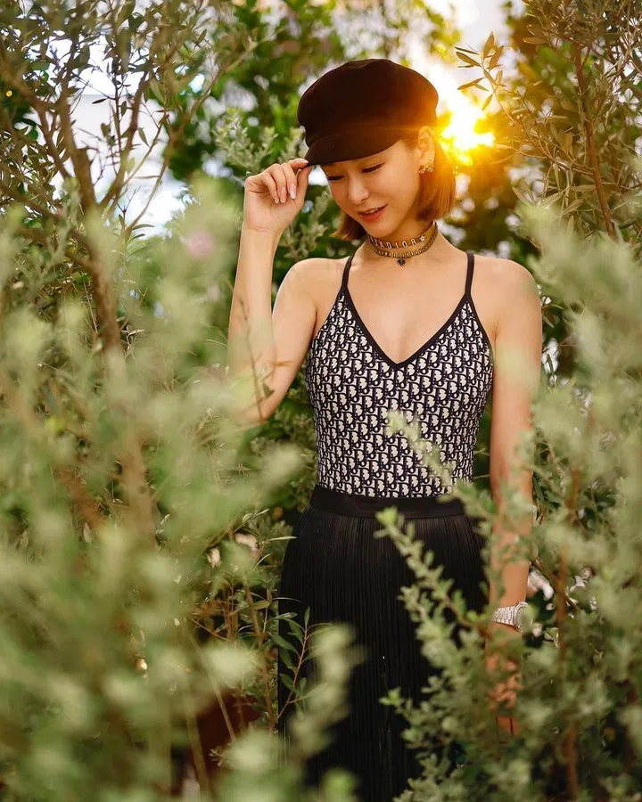 本地艺人王智荟Kimberly身穿Dior吊带透视薄纱连衣裙,外搭浅灰色印花夹克,脚上的Dior-ID运动鞋为整体注入休闲感。