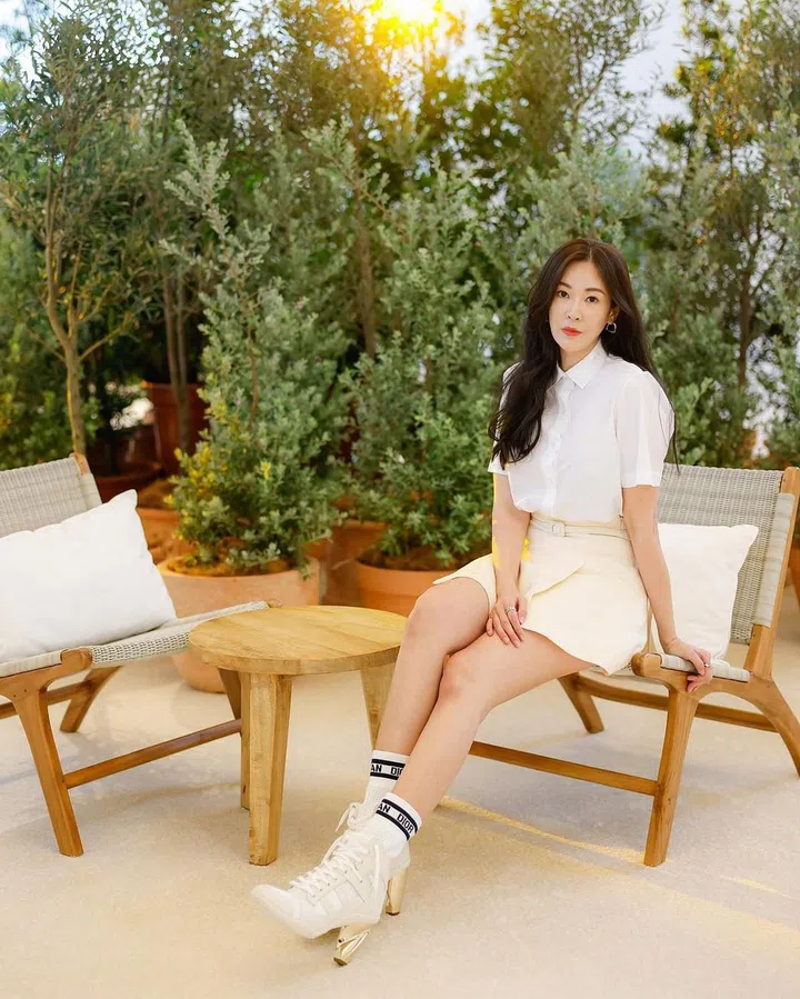 名媛Chloe Ng身穿饰有Dior Star 图案的立领针织衫,搭配白色短裙和2022早春系列的Dior Rhodes高跟鞋,展现柔美的穿搭风格。