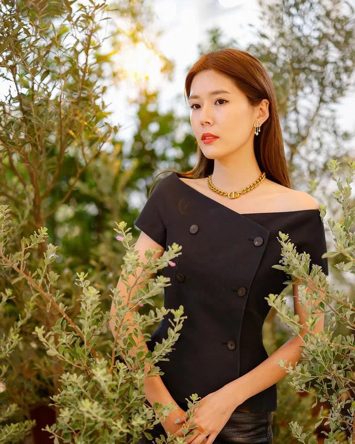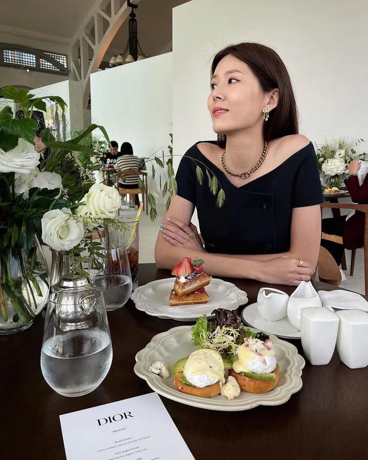 在Dior Café享用早午餐的黄思恬以一袭Dior双排扣露肩西装外套和皮革短裙,搭配Dior的Petit CD耳环及30 Montaigne短项链,诠释优雅姿态。