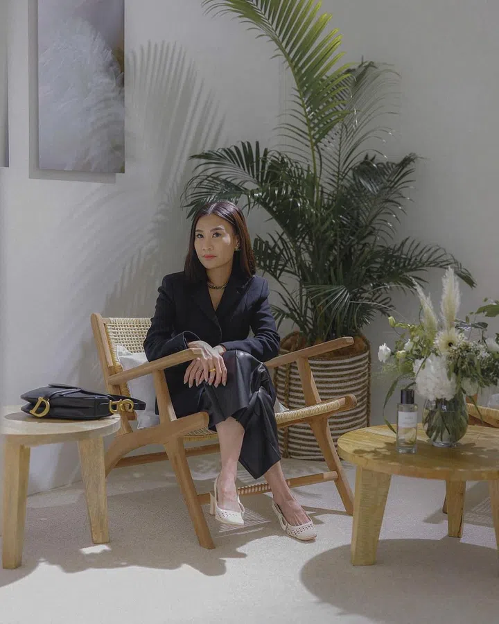 时尚博主Salina Chai身着Dior经典的西装外套配以黑色长裤,手提黑色Dior Saddle马鞍包,脚踩Dior & Moi 露跟高跟鞋,利落干练的风格打造摩登女性装束。