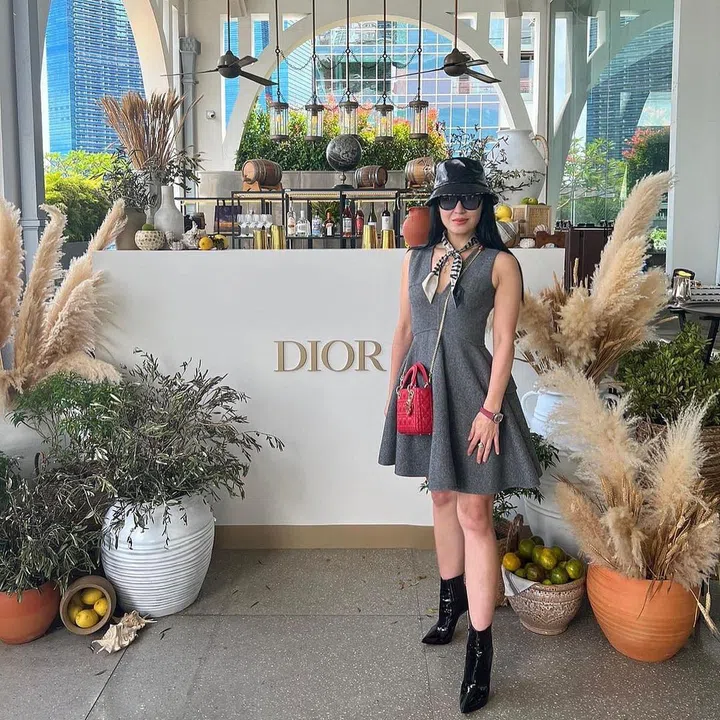 名媛Nina Ng选择了Dior V领灰色连衣裙,搭配Dior丝巾、Teddy-D宽檐桶帽和高跟及踝靴,并以抢眼的红色Lady Dior迷你包,为造型增添点亮。