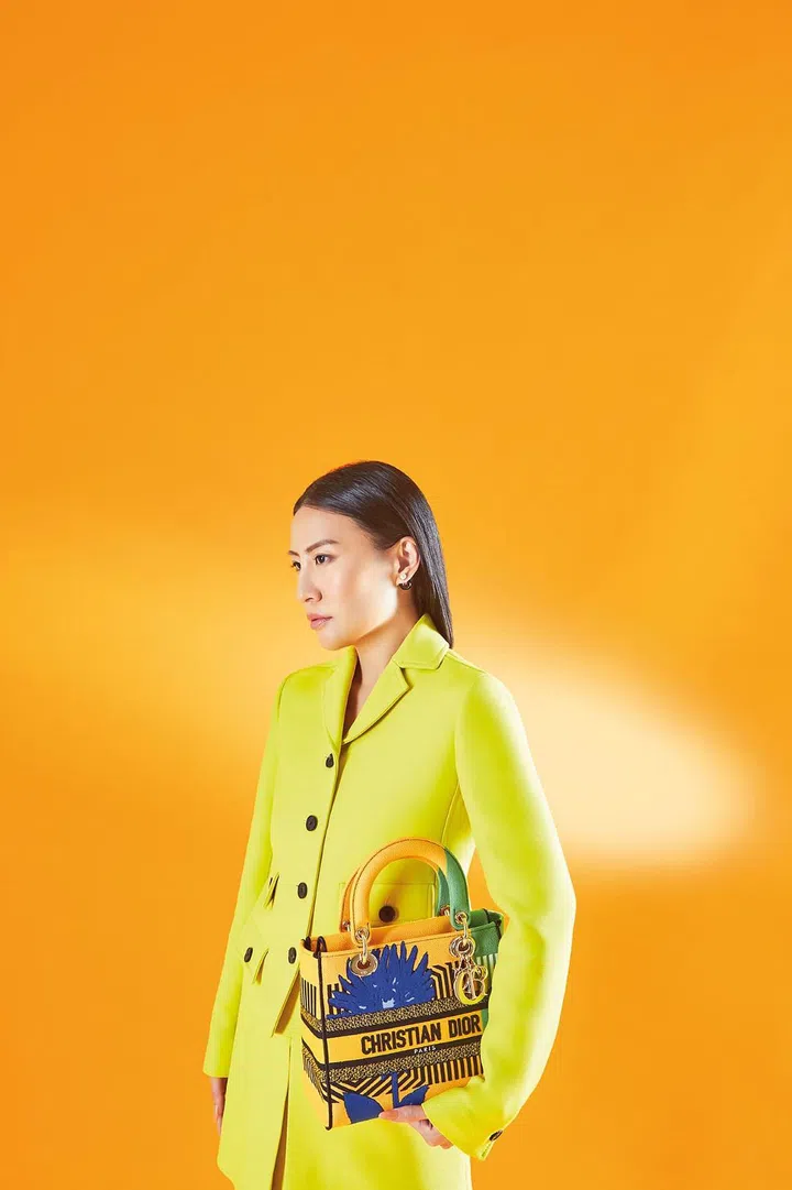 (Kimberly)羊毛丝绸夹克和半身裙、棉府绸衬衫、Dior Vibe手袋、Dior Sorbet戒指/Dior。