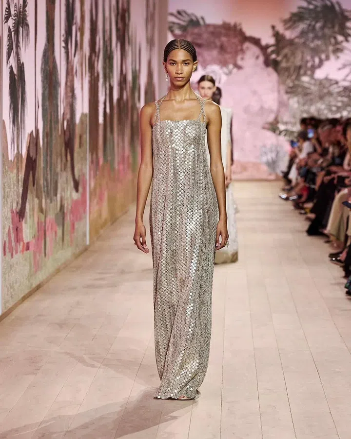 本季高级定制系列服装以中性色调为主,与展示空间内丰富多彩的背景形成鲜明对比。开场造型以洁白的海洋色调开始,随后逐渐过渡为米色、黑色、银色和淡金色。和谐的色调将人们的注意力放在了细节之上,聚焦于雕塑般的轮廓、色调相近的格栅图案以及精细的刺绣,展示Dior华丽精湛的工艺。