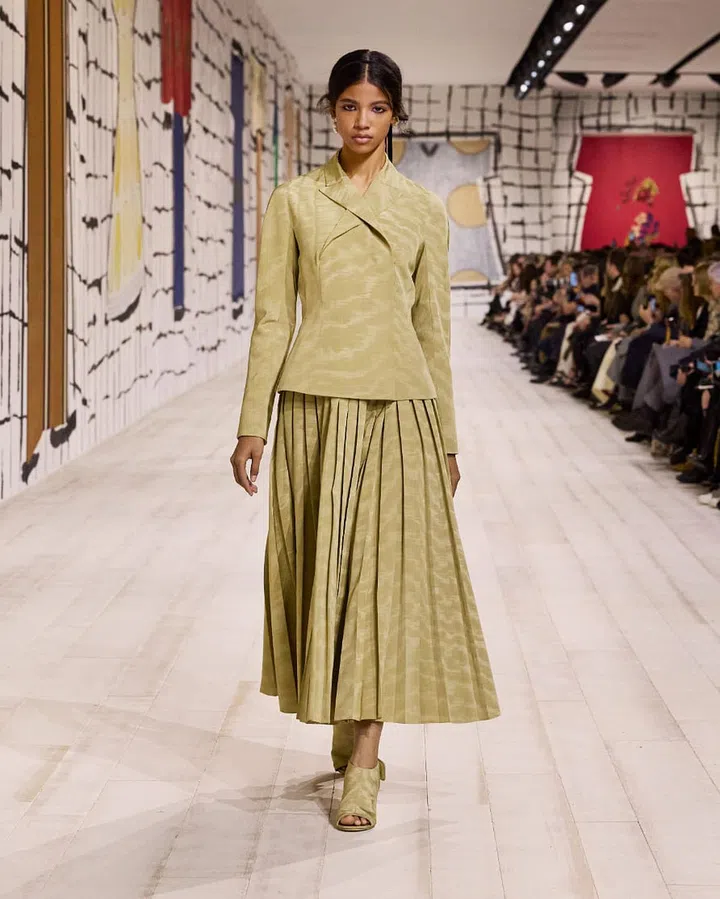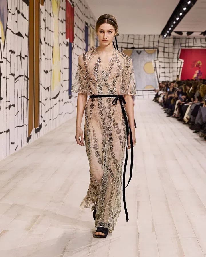 Maria Grazia Chiuri从品牌创始人克里斯汀·迪奥(Christian Dior)1952年秋冬设计的La Cigale——一款标志性灰色云纹连衣裙中汲取灵感,重新审视品牌经典,为当代造型注入了活力。