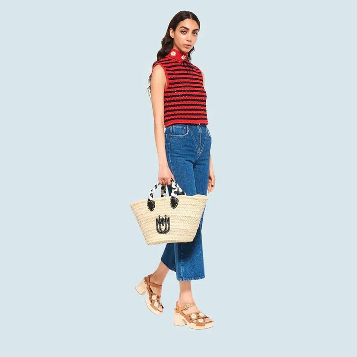 托特包不单只是由常见的帆布和皮革制成,Miu Miu 在2020年春夏系列中推出的这款Palmetto编织托特包,不禁让人想拎着它,到海边走一趟。包身上的皮革徽标则为编织手袋增添了现代感。