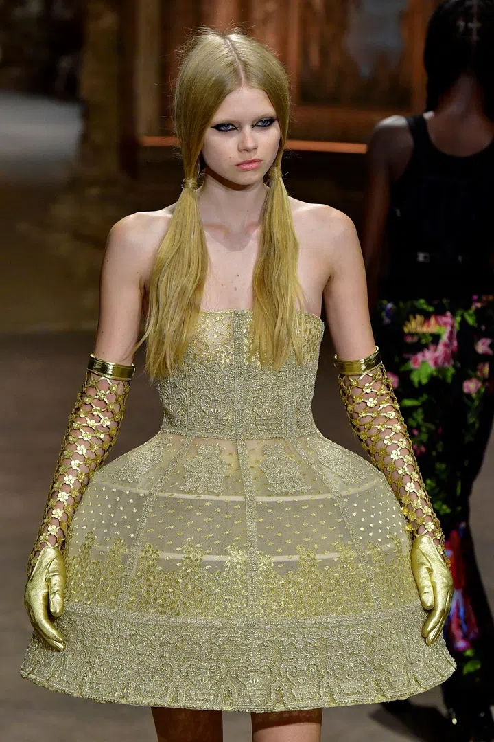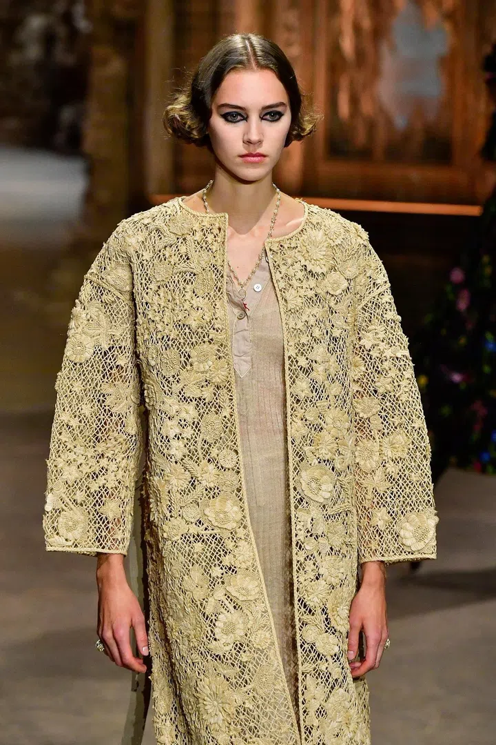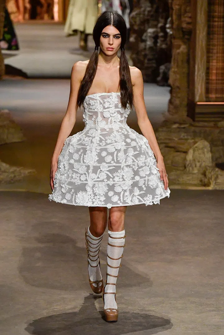 为还原中世纪宫廷风的华丽,Chiuri采用大量的刺绣和蕾丝工艺,在网眼罩裙中融入立体花卉装饰,交叠的层次错落有致,搭配曲线流畅的廓形与剪裁,将奢华感展现得淋漓尽致。成衣中所使用的“蕾丝”,还是经过特殊处理的环保拉菲草,经Chiuri与设计师团队的巧手编织,才能化作独特的手套、上衣、腰封、连衣裙或丝袜等。