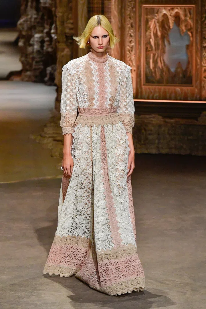 在这个意义深远的庭园,Chiuri将盛行一时的传统时尚元素融入现代潮流当中,实现了一场跨越时空的思想对话。她重新演绎凯瑟琳时期的服装廓形,再借由精美蕾丝与细腻刺绣,打造出符合现代使用场景的精致简约宫廷风。