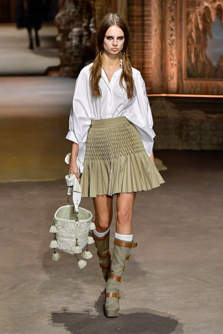 经过时代的洗礼,女性不再受到拘束,在服装选择上也越发喜爱衬托潇洒气质。Chiuri为此设计一系列飘逸感十足的长袍或裙摆,以传统的褶皱点缀,让柔软的材质与版型轻松升华,随着模特轻盈的步伐摇曳生姿,灵动吸睛。