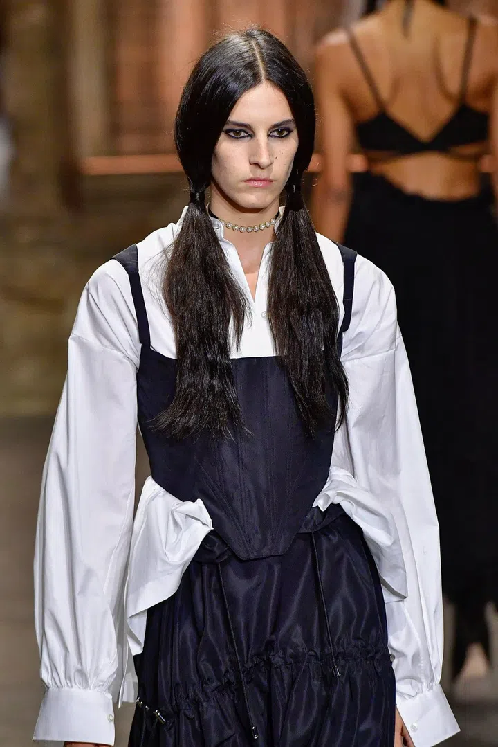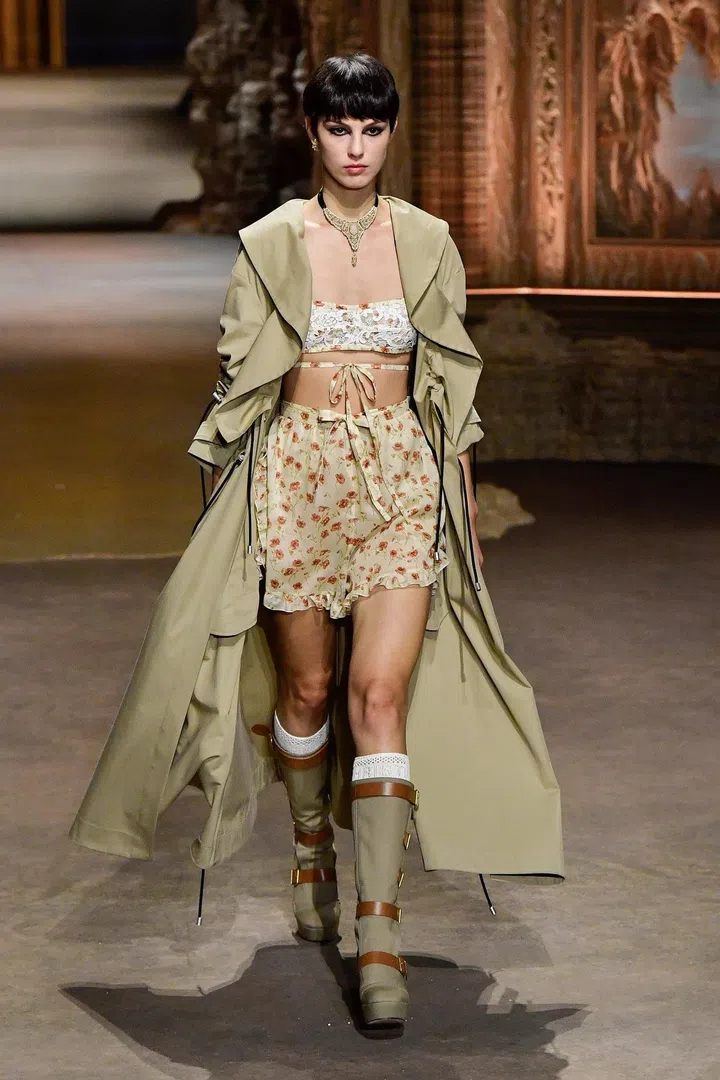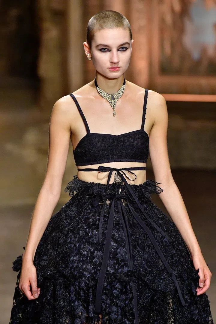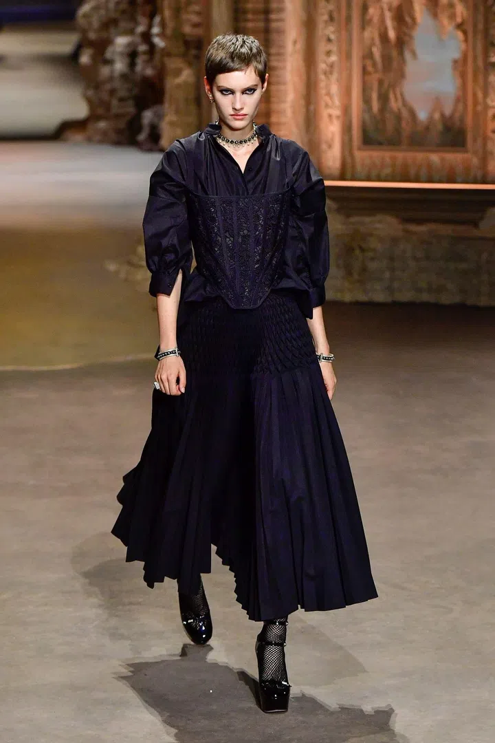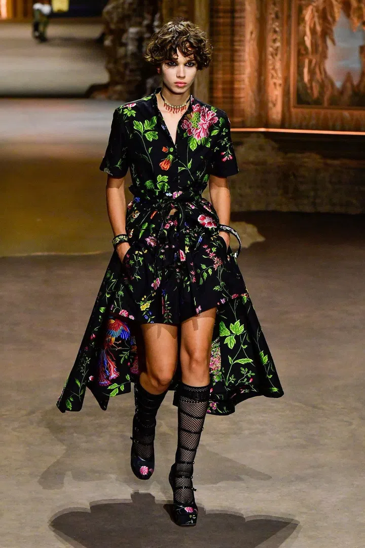 Chiuri透过充满现代感的设计眼光,重新诠释马甲、衬裙、刺绣等古典服装元素,将其化为轮廓立体的平口黑色小洋装,以及融入衬裙的蕾丝长裙混搭,或是为束胸马甲穿上宽松版型搭配Oversized衬衫,谱写属于当代的古典着装美学。为颂扬具启发性的先驱,Chiuri也以盛放的花朵和栩栩如生的雀鸟点缀独特新作,既神秘又引人入胜。