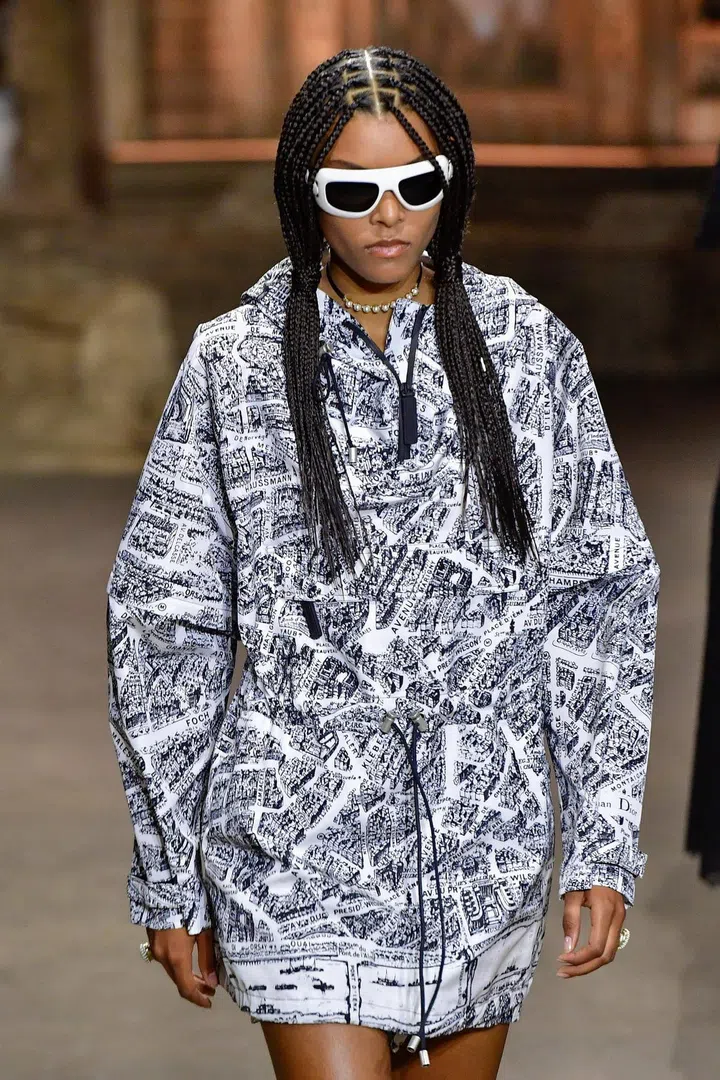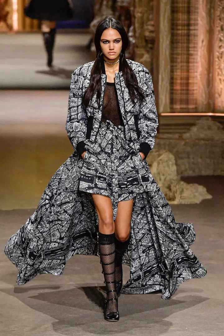 该系列还着重强调对品牌历史的传承,核心灵感之一源于典藏中的一幅巴黎地图。Chiuri在翻看品牌历史档案时,偶然发现品牌创始人Christian Dior在1950年代设计的颈巾。地图以蒙田大道(Avenue Montaigne)占据中心,让她不禁回想起自己在时尚圈一路奋斗的历程。巴黎市是她成长与成功的地方,承载了她的梦想与动力,使Chiuri深受启发,便把地图印在棉质成衣上,大面积的黑白素描时尚前卫,串联古今,呈现全新Plan de Paris主题图案。玩味明暗和透视,花都的街景和地标勾勒在超凡的女装作品上。