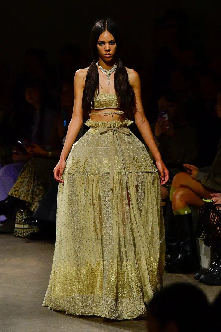 2023春夏秀场墙体还铺满印度刺绣工坊绣制的艺术画像,搭配悠远的音效,缠绵的开场舞蹈,让看客仿佛误入一部正在播放的古老电影当中,与故事中的人物一同细细品味巴黎市的回忆。
