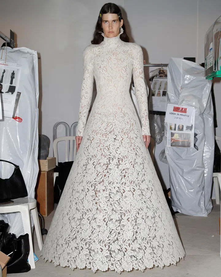 本季系列延续Demna标志性的设计语言:夸张廓形、结构张力与功能性的微妙平衡,以更内敛成熟的方式呈现。被解构、重组的经典元素仿佛是他与巴黎世家之间一场无声的告别对话。不同于过去惯常的讽刺、叛逆,Demna的谢幕之作回归剪裁与工艺本质,雕塑感肩线、收腰轮廓、拖地大衣构建出高级定制的严谨结构美学,其中多件作品更耗费工坊数百小时纯手工打造,彰显品牌深厚的工艺底蕴。当天,Balenciaga新任创意总监、前Valentino设计师Pierpaolo Piccioli亦亲临现场。他将于10月巴黎时装周发布首个成衣系列,为Balenciaga掀开全新篇章。