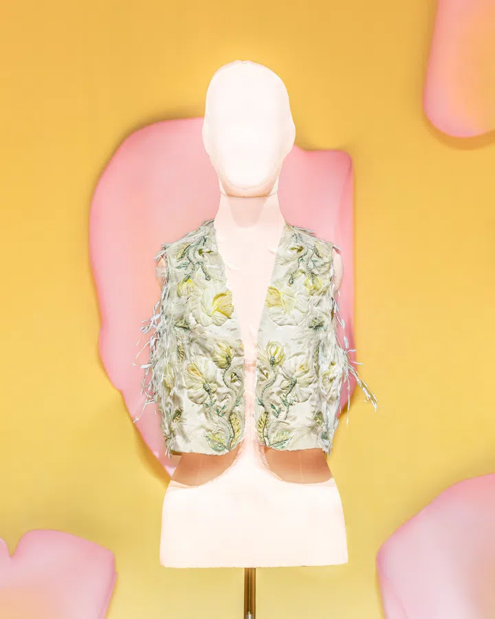 展厅设计亦延续浪漫氛围,Roger Vivier巴黎总部的Salle d’Argent大廳以柔和丝绒与粉彩陶瓷花瓣营造梦幻场域。手袋陈列于花瓣摇篮中,如同藏于花苞中的艺术品,中央一朵悬浮玫瑰雕塑成为视觉焦点,烘托出系列温柔与锐利并存的调性。La Rose Vivier Pièce Unique 既是对工艺与时尚融合的颂歌,也见证了品牌与Lesage在法式传统与创新间的共鸣。