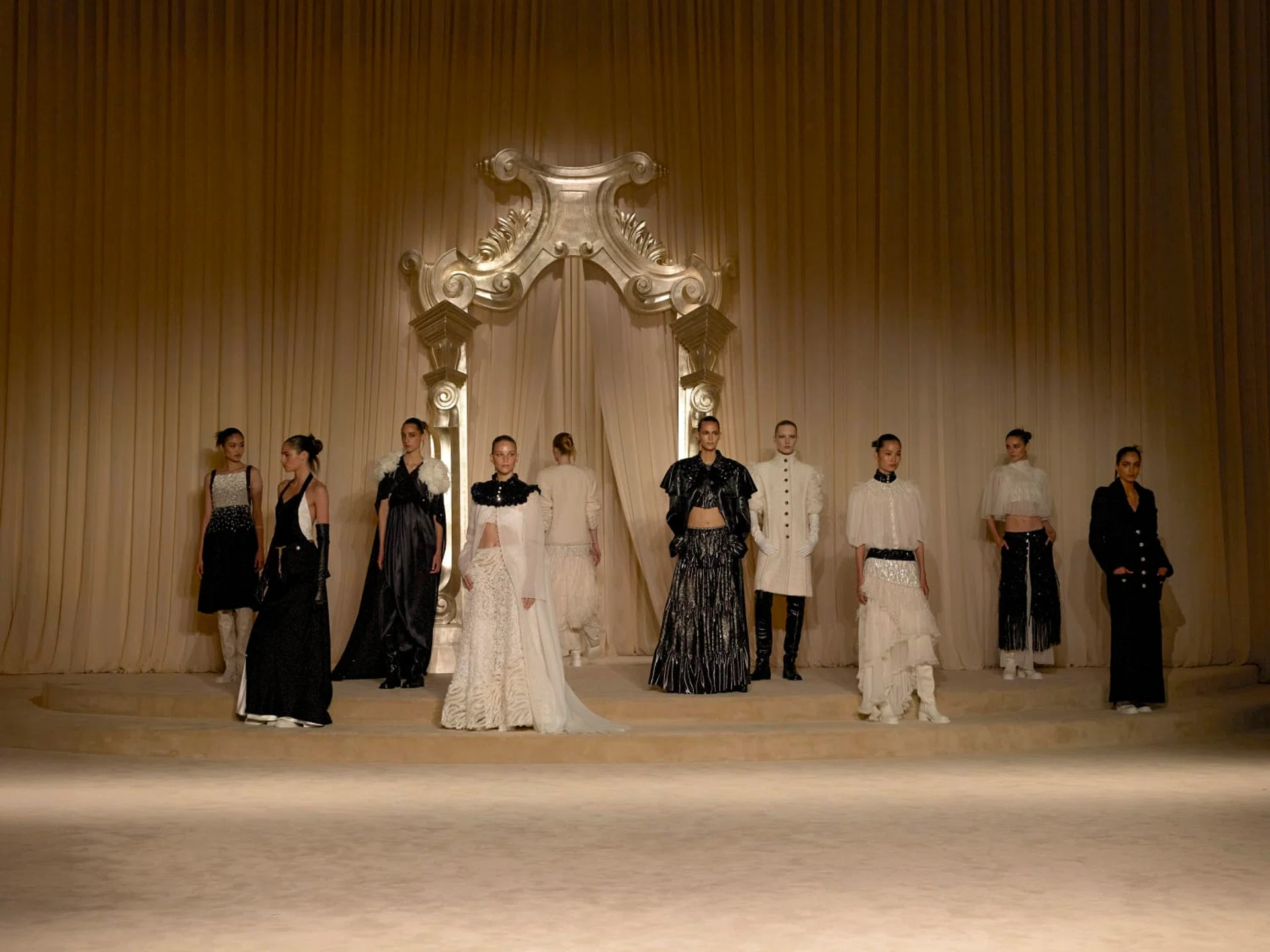 系列以轻盈飘逸的长裙为开场,点缀亮色刺绣;随着黑色造型陆续登场,晚礼服与燕尾服展现出全新样貌:贴身的雕塑感夹克、剪裁利落的西装外套搭配白衬衫与合身西裤,延续品牌一贯的精致风格。曳地长裙通过蝴蝶结、薄纱装饰与手镯式袖口,展现内敛而考究的细节。天鹅绒与带有金属光泽的真丝交叠组合,内衬则镶满水晶与金色元素,形成强烈对比,突显精湛工艺。