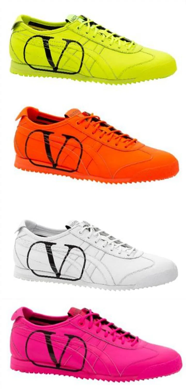 不仅如此,Valentino也携手日本时尚运动品牌Onitsuka Tiger,以四种鲜明的色调重新演绎著名鞋款MEXICO 66 SD运动鞋,分别由黄、橙、桃红和白四种颜色,加上侧面的Valentino经典V标志,呈现两个品牌的独家创作款式,极具代表性。