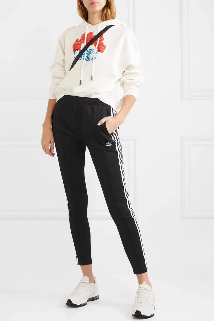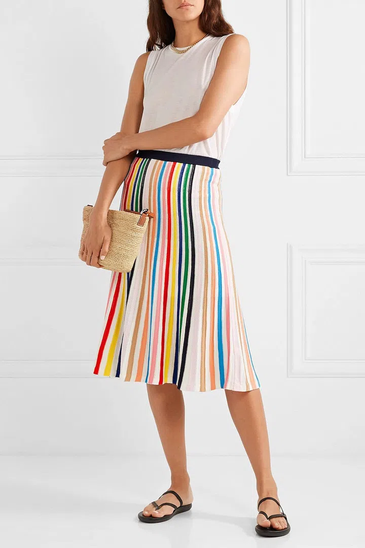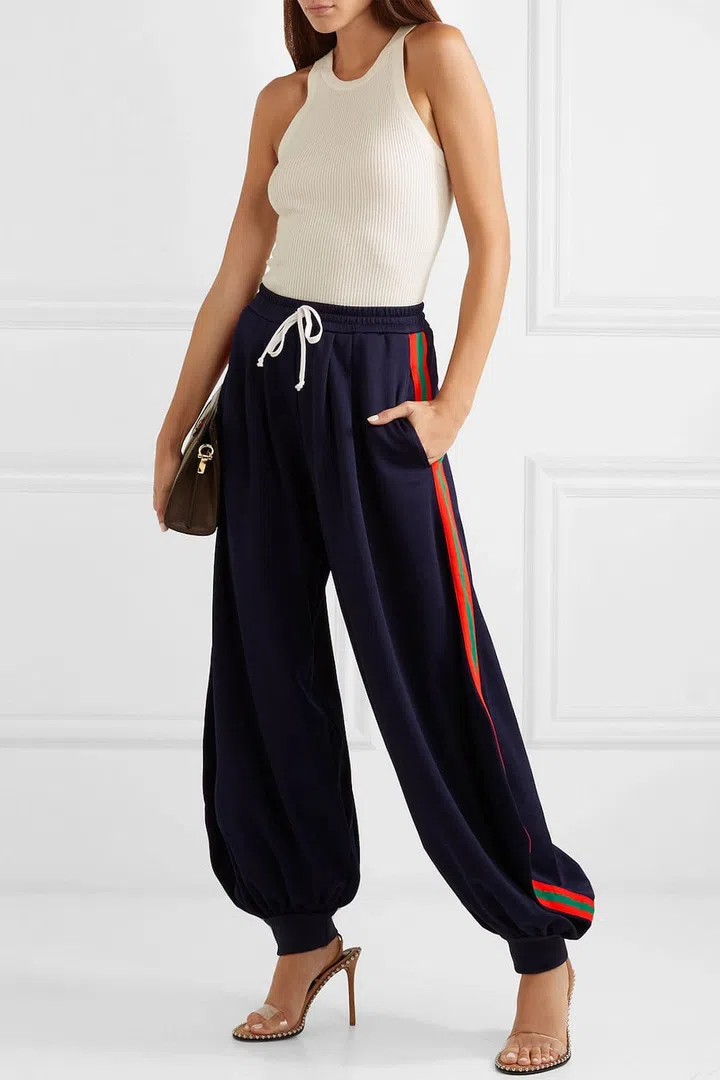 想要尝试条纹又不想太铺张,可以从小处开始,如带有条纹的长裤。纵向条纹在侧面出现,有拉长腿部的效果。